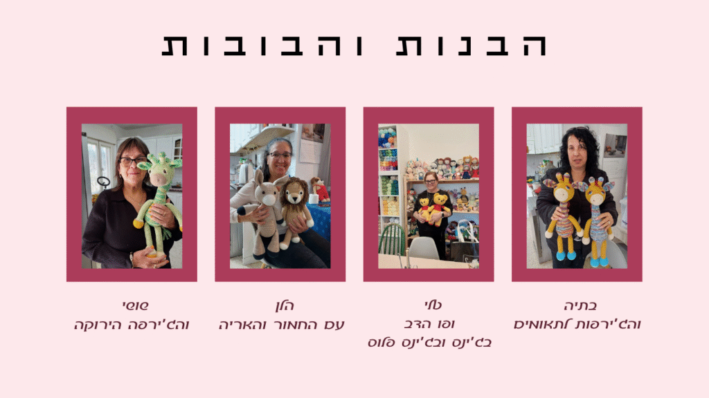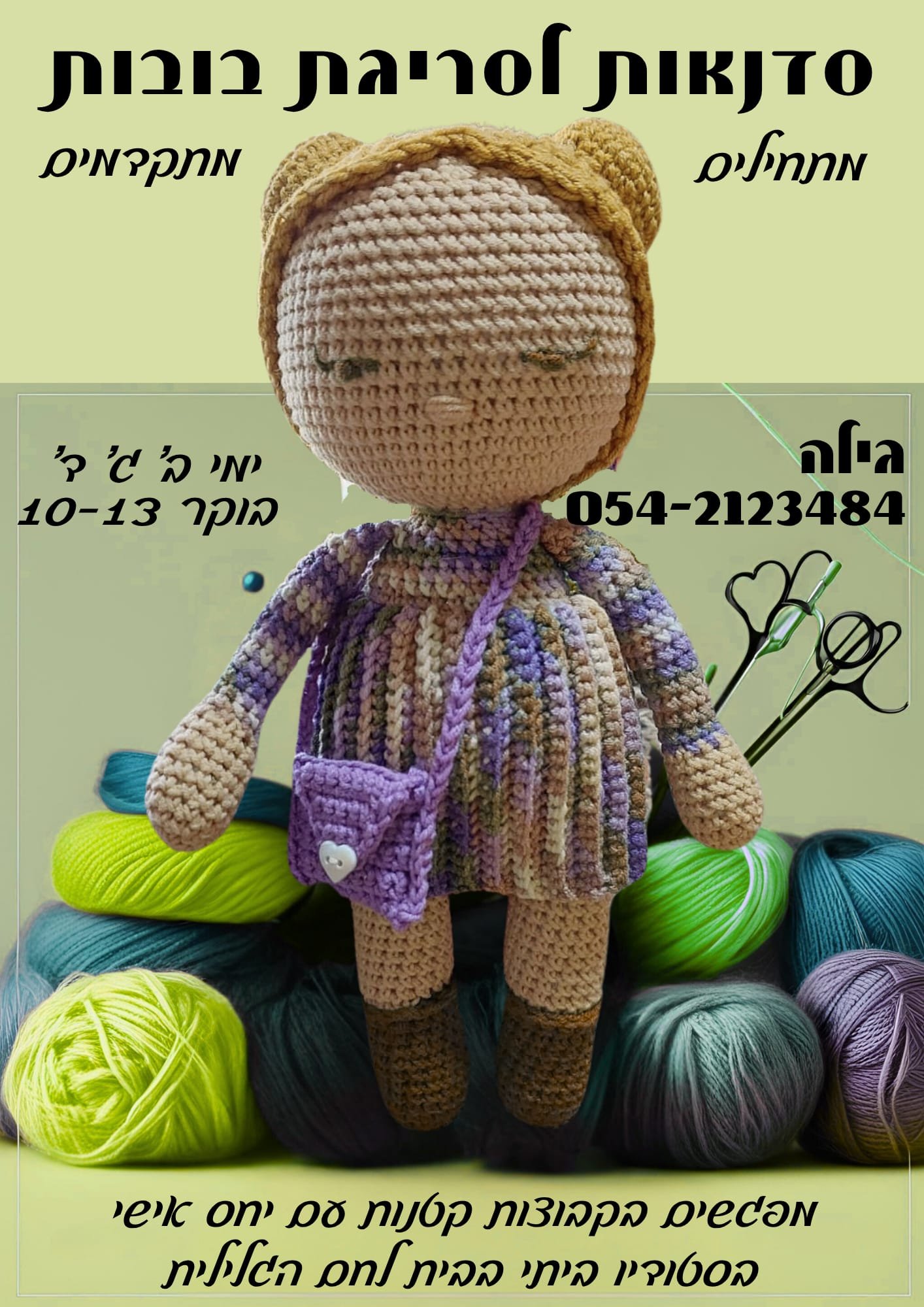 הסטודיו הביתי והחמים שלי הוא המקום שבו יצירה, חלום ודמיון מתחברים יחד לחוויה קסומה של סריגה. כאן נולדות בובות בעבודת יד, בעיצוב אישי, מלאות צבע, טקסטורה וחיוך – ותמיד מתוך אהבה גדולה.