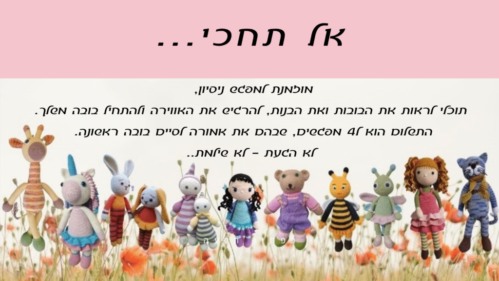 מכינה עבורן הוראות סריגה מפורטות וברורות מלוות בתמונות, בעברית ובאנגלית,